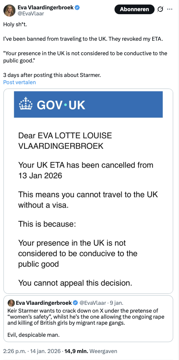 - Bent u bekend met het bericht dat de Nederlandse opiniemaker Eva Vlaardingerbroek de toegang tot het Verenigd Koninkrijk is ontzegd omdat “haar aanwezigheid niet bevorderlijk wordt geacht voor het algemeen belang” – een paar dagen nadat ze een kritische tweet over de Britse premier Starmer plaatste?